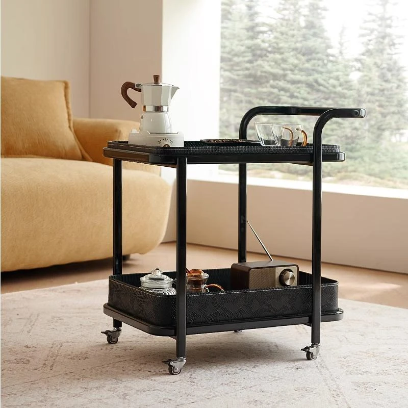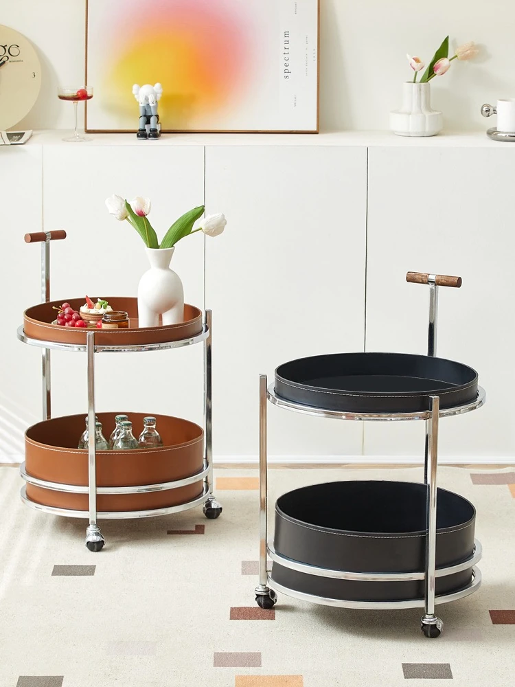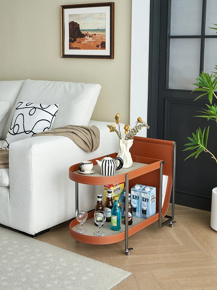 Italian Modern Minimalist Mobile Cart – Luxurious Saddle Leather Rolling Sofa Side Table, Coffee Table, Living Room Accent Table with Wheels, Ideal for Effortless Style and Functionality.