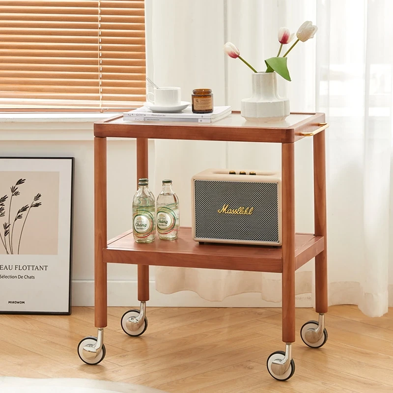Nordic Japanese Style Ash Wooden Small Cart Side Table - Mobile Living Room Coffee Table for Small Spaces - Cherry Wood Finish with Glass Corner Design