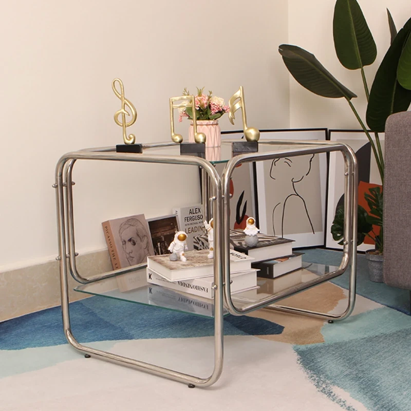 モダンでシンプルなステンレス製ガラスコーヒーテーブル - スタイリッシュなリビング空間にぴったり!カフェや民宿の撮影、収納にも最適なサイドテーブル。