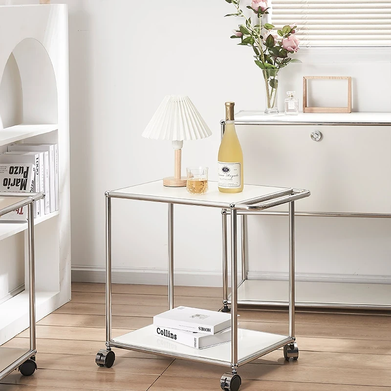 イタリアンステンレス製サドルレザー移動式キャリーコーナーラック - モダンでシンプルなデザインのリビング用ソファサイドテーブル、洗練されたクリエイティブなスタイルをお楽しみください!